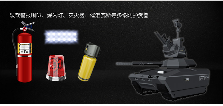 安保机器人装载警报喇叭、爆闪灯、灭火器、催泪瓦斯等多级防护武器